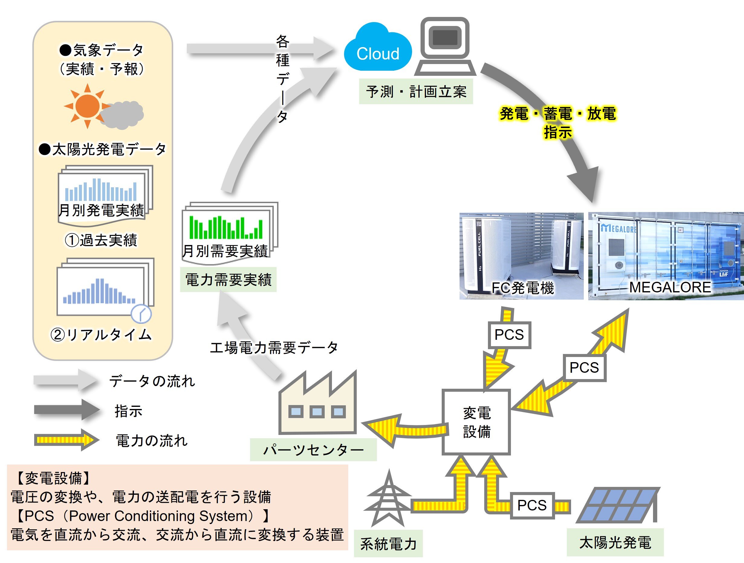 高浜工場内にある「E PLAZA」では、太陽光発電、定置用蓄電システム「MEGALORE」、そしてFCモジュールを活用した「FC発電機」を組み合わせ、効率的な再エネ運用を実証中です。